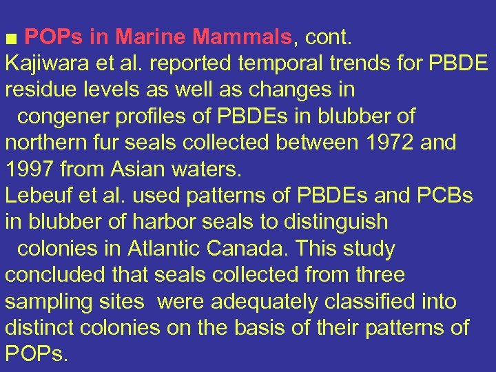 ■ POPs in Marine Mammals, cont. Kajiwara et al. reported temporal trends for PBDE residue levels as well as changes in congener profiles of PBDEs in blubber of northern fur seals collected between 1972 and 1997 from Asian waters. Lebeuf et al. used patterns of PBDEs and PCBs in blubber of harbor seals to distinguish colonies in Atlantic Canada. This study concluded that seals collected from three sampling sites were adequately classified into distinct colonies on the basis of their patterns of POPs.