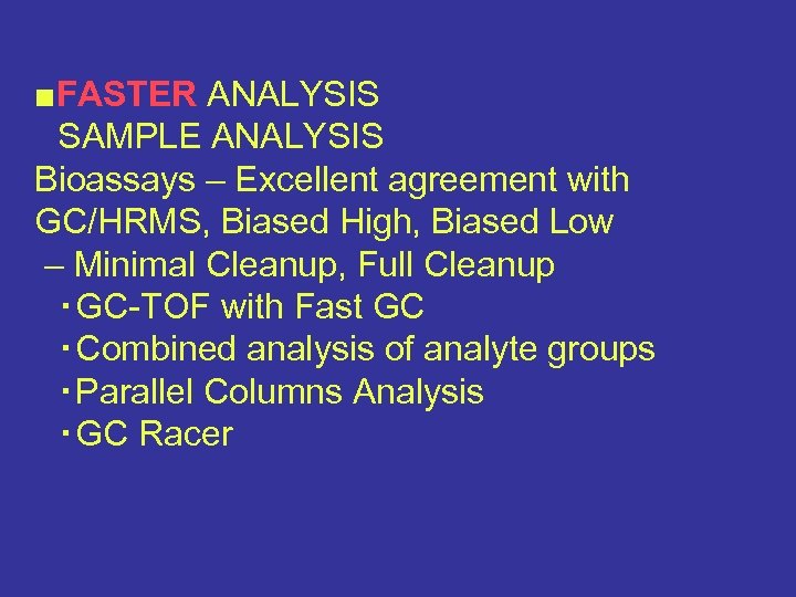 ■FASTER ANALYSIS SAMPLE ANALYSIS Bioassays – Excellent agreement with GC/HRMS, Biased High, Biased Low – Minimal Cleanup, Full Cleanup ・GC-TOF with Fast GC ・Combined analysis of analyte groups ・Parallel Columns Analysis ・GC Racer