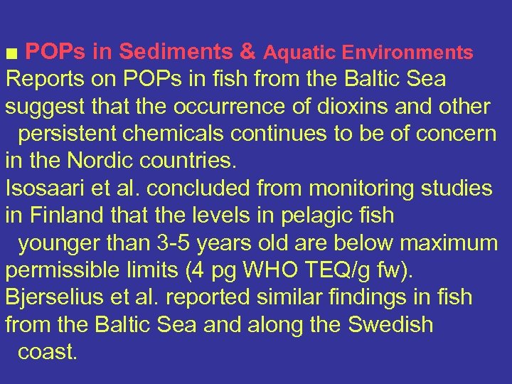 ■ POPs in Sediments & Aquatic Environments Reports on POPs in fish from the Baltic Sea suggest that the occurrence of dioxins and other persistent chemicals continues to be of concern in the Nordic countries. Isosaari et al. concluded from monitoring studies in Finland that the levels in pelagic fish younger than 3 -5 years old are below maximum permissible limits (4 pg WHO TEQ/g fw). Bjerselius et al. reported similar findings in fish from the Baltic Sea and along the Swedish coast.