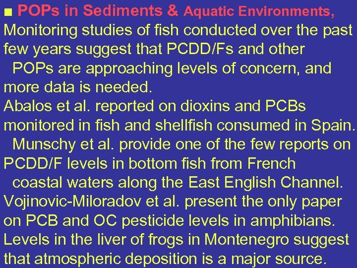 ■ POPs in Sediments & Aquatic Environments, Monitoring studies of fish conducted over the past few years suggest that PCDD/Fs and other POPs are approaching levels of concern, and more data is needed. Abalos et al. reported on dioxins and PCBs monitored in fish and shellfish consumed in Spain. Munschy et al. provide one of the few reports on PCDD/F levels in bottom fish from French coastal waters along the East English Channel. Vojinovic-Miloradov et al. present the only paper on PCB and OC pesticide levels in amphibians. Levels in the liver of frogs in Montenegro suggest that atmospheric deposition is a major source.