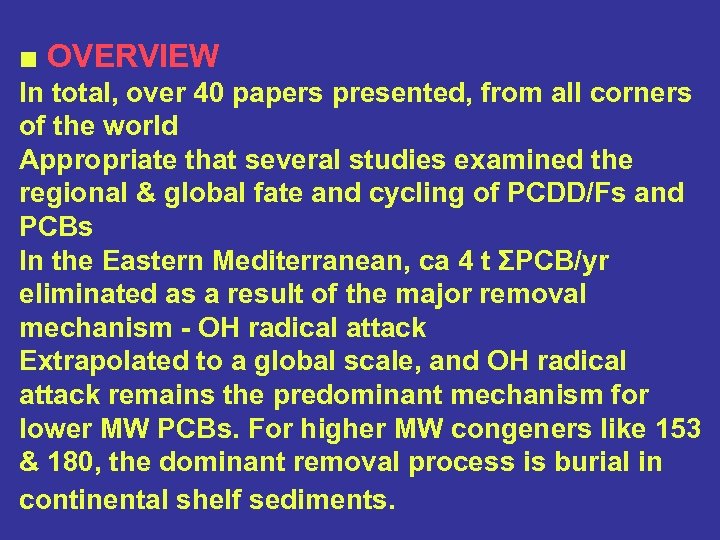 ■ OVERVIEW In total, over 40 papers presented, from all corners of the world Appropriate that several studies examined the regional & global fate and cycling of PCDD/Fs and PCBs In the Eastern Mediterranean, ca 4 t ΣPCB/yr eliminated as a result of the major removal mechanism - OH radical attack Extrapolated to a global scale, and OH radical attack remains the predominant mechanism for lower MW PCBs. For higher MW congeners like 153 & 180, the dominant removal process is burial in continental shelf sediments.