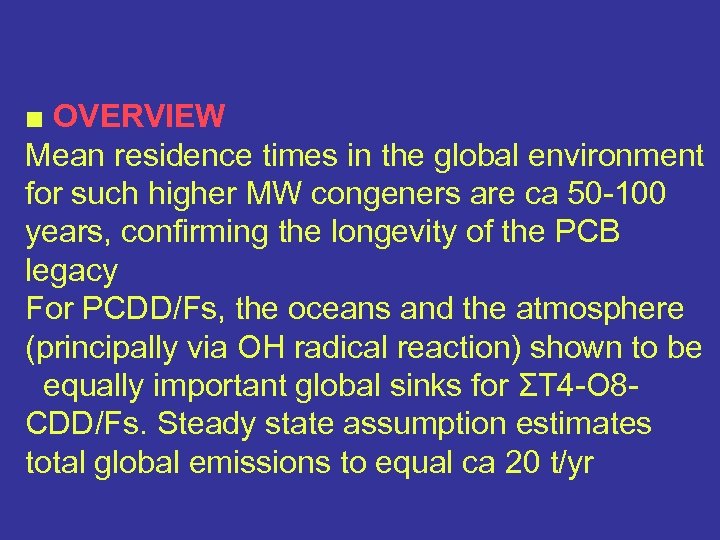 ■ OVERVIEW Mean residence times in the global environment for such higher MW congeners are ca 50 -100 years, confirming the longevity of the PCB legacy For PCDD/Fs, the oceans and the atmosphere (principally via OH radical reaction) shown to be equally important global sinks for ΣT 4 -O 8 CDD/Fs. Steady state assumption estimates total global emissions to equal ca 20 t/yr