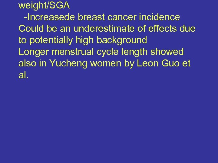 weight/SGA -Increasede breast cancer incidence Could be an underestimate of effects due to potentially high background Longer menstrual cycle length showed also in Yucheng women by Leon Guo et al.