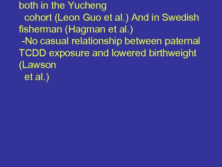 both in the Yucheng cohort (Leon Guo et al. ) And in Swedish fisherman (Hagman et al. ) -No casual relationship between paternal TCDD exposure and lowered birthweight (Lawson et al. )