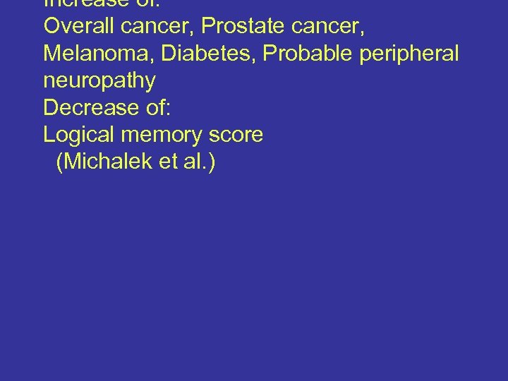 Increase of: Overall cancer, Prostate cancer, Melanoma, Diabetes, Probable peripheral neuropathy Decrease of: Logical memory score (Michalek et al. )