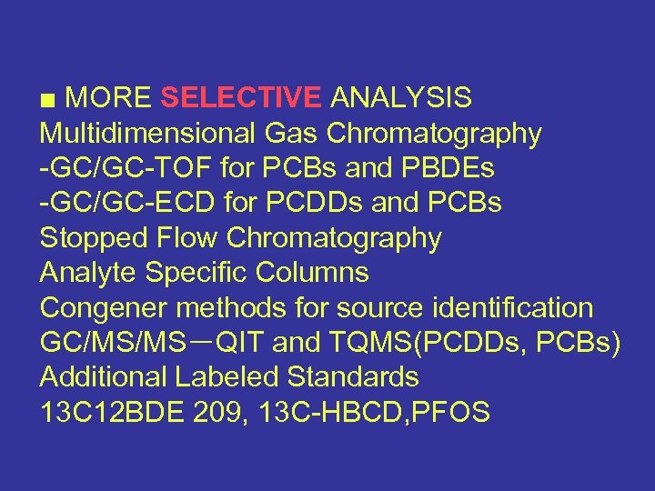 ■ MORE SELECTIVE ANALYSIS Multidimensional Gas Chromatography -GC/GC-TOF for PCBs and PBDEs -GC/GC-ECD for PCDDs and PCBs Stopped Flow Chromatography Analyte Specific Columns Congener methods for source identification GC/MS/MS-QIT and TQMS(PCDDs, PCBs) Additional Labeled Standards 13 C 12 BDE 209, 13 C-HBCD, PFOS