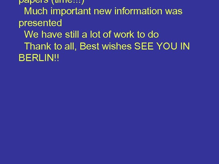 papers (time!!!) Much important new information was presented We have still a lot of work to do Thank to all, Best wishes SEE YOU IN BERLIN!!