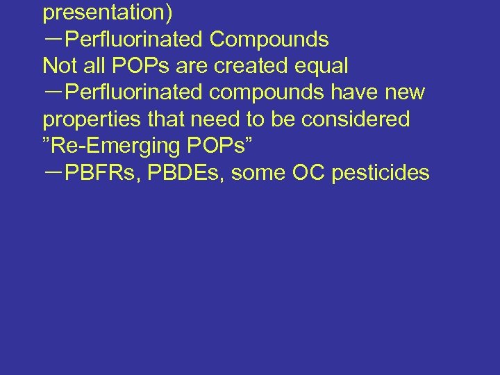 presentation) -Perfluorinated Compounds Not all POPs are created equal -Perfluorinated compounds have new properties that need to be considered ”Re-Emerging POPs” -PBFRs, PBDEs, some OC pesticides