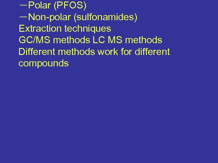 -Polar (PFOS) -Non-polar (sulfonamides) Extraction techniques GC/MS methods LC MS methods Different methods work for different compounds