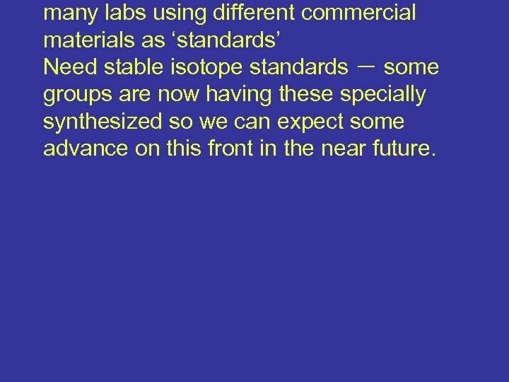 many labs using different commercial materials as ‘standards’ Need stable isotope standards - some groups are now having these specially synthesized so we can expect some advance on this front in the near future.