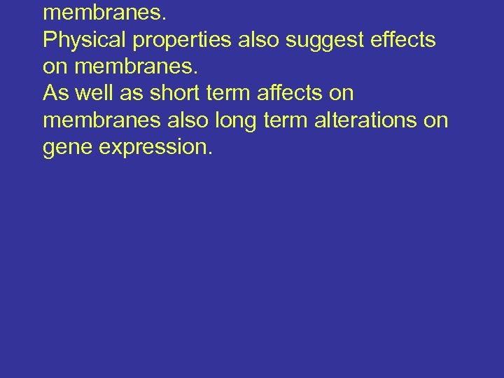 membranes. Physical properties also suggest effects on membranes. As well as short term affects on membranes also long term alterations on gene expression.