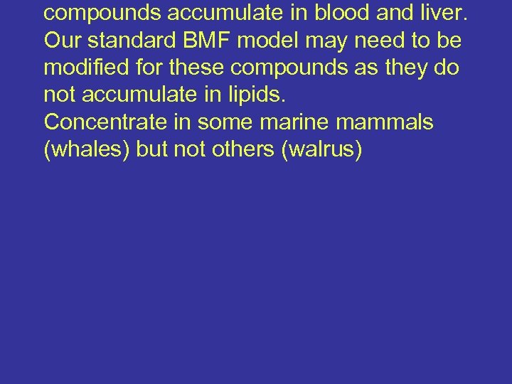 compounds accumulate in blood and liver. Our standard BMF model may need to be modified for these compounds as they do not accumulate in lipids. Concentrate in some marine mammals (whales) but not others (walrus)