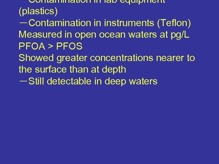 -Contamination in lab equipment (plastics) -Contamination in instruments (Teflon) Measured in open ocean waters at pg/L PFOA > PFOS Showed greater concentrations nearer to the surface than at depth -Still detectable in deep waters