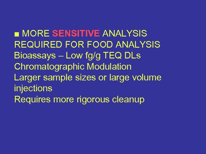 ■ MORE SENSITIVE ANALYSIS REQUIRED FOR FOOD ANALYSIS Bioassays – Low fg/g TEQ DLs Chromatographic Modulation Larger sample sizes or large volume injections Requires more rigorous cleanup