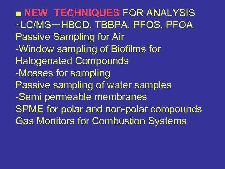 ■ NEW TECHNIQUES FOR ANALYSIS ・LC/MS-HBCD, TBBPA, PFOS, PFOA Passive Sampling for Air -Window sampling of Biofilms for Halogenated Compounds -Mosses for sampling Passive sampling of water samples -Semi permeable membranes SPME for polar and non-polar compounds Gas Monitors for Combustion Systems