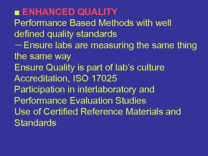 ■ ENHANCED QUALITY Performance Based Methods with well defined quality standards -Ensure labs are measuring the same thing the same way Ensure Quality is part of lab’s culture Accreditation, ISO 17025 Participation in interlaboratory and Performance Evaluation Studies Use of Certified Reference Materials and Standards