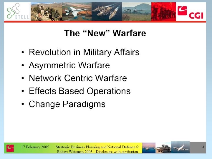 Chief of the Defence Force • “We are living in very uncertain times. Our Defence Organization, and the Defence Force in particular, must be agile enough to adjust to the ever-increasing and diverse demands of the future. ” (page iii) P. J. Cosgrove AC, MC, (2004), Enabling Future Warfighting: Network Centric Warfare Concept, ADDP-D. 3. 1