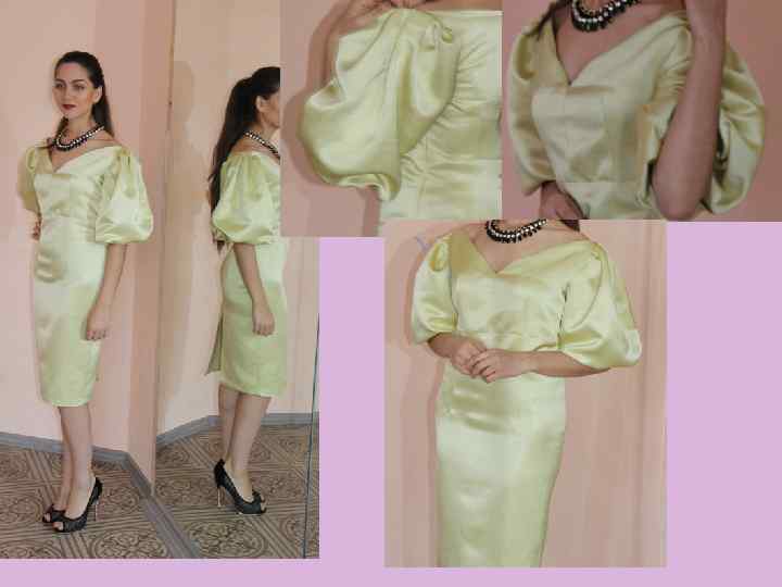 Анализ модели Вечернее платье прилегающего силуэта с завышенной талией. Модель – симметричная. Рукава «фонарик» втачные. Застежка – потайная молния в боковом шве. Длина платья чуть ниже колен. Ткань плотная, из натуральных материалов, что весьма усложнило работу над изделием. Перед – две детали, сшитые между собой по 1 й вертикале, с выточками по линии талии. Спинка состоит из одной детали с выточками по линии талии. Низ горловины спинки и переда выполнен подкройной обтачкой. Рукава «фонарик» собраны внизу на резинке. Юбка «карандаш» с разрезом по 9 й вертикале. Припуск на подгибку низа обработан потайным швом.
