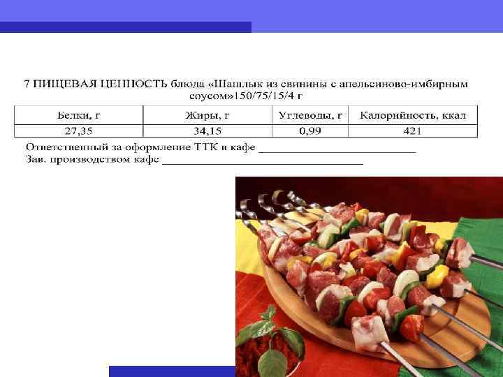 Вино столовое сливовое, 50 г Апельсины, 68 г Масло растительное, 15 г п/о Мелкая рубка 30 г Свинина, 259 г 2 г Сок, Лимон, 100 г п/о Имбирь, 2, 7 г Лимон зеленый, 16, 7 г Зелень петруш-ки, 5, 5 г п/о п/о 39 г 220 г 15 г 4 г Отделение цедры, Нарезка на порционные куски, 4 – 5 шт х 45 – 50 г Нарезка полукругами Мелкая рубка 4 г Джем апельсиновый, 10 г Маринад Соль Перец Маринование, t +2 +6 o. C, 3 – 4 ч Маринованное мясо Маринад, 100 г Жаренье на открытом огне Упаривание до 2/3 объема Шашлык, 150 г Процеживание с последующим протиранием Соус апельсиново – имбирный, 75 г «Шашлык из свинины с апельсиново – имбирным соусом» , t 60 -65 o. C, 150/75/15/ г