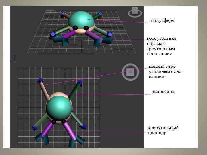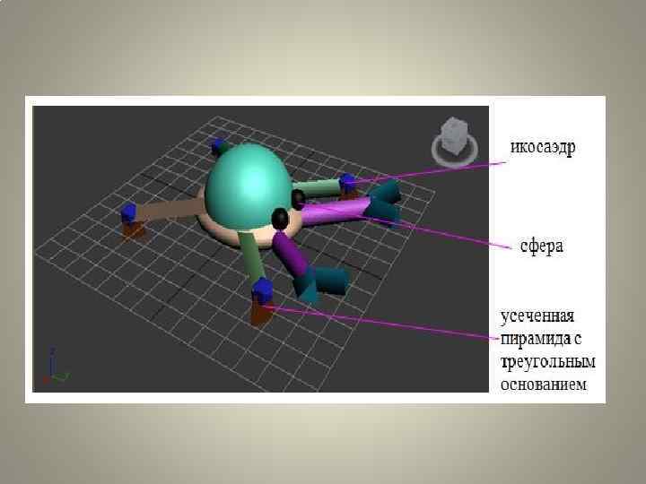 ПОШАГОВОЕ ПОСТРОЕНИЕ МОДЕЛИ СЛОЖНОГО ОБЪЕКТА Декомпозиция сложного объекта • Моделью сложного трехмерного объекта, согласно заданию, является модель робота-краба, которая состоит из таких базовых примитивов как: эллипсоид, икосаэдр, призма с треугольным основанием, сфера, косоугольный цилиндр, усеченная пирамида с треугольным основанием, полусфера, косоугольная призма с треугольным основанием. • Модель робота-краба состоит из лап (призма с треугольным основанием, икосаэдр, усеченная пирамида с треугольным основанием), лап (косоугольный цилиндр) с клещнями (косоугольная призма с теугольным основанием), глаз (сфера), тело (полусфера, элипсоид).