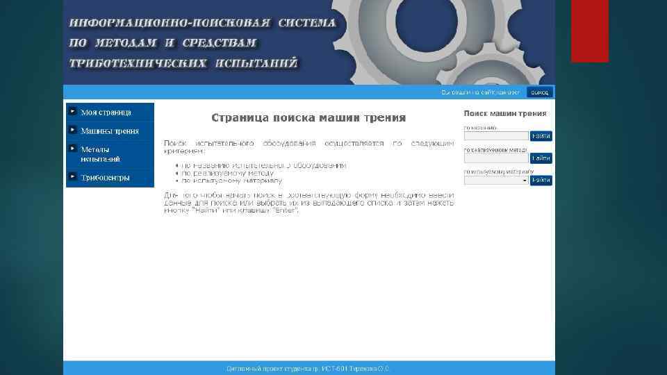 Цель и задачи Целью данной работы является разработка трибологического научно – методического комплекса для центров технического обучения и повышения квалификации инженерных кадров в сфере машиностроения. Задачи: систематизация и концентрирование наработок по трибологии в машиностроении; иерархичное и логично скомпонованное представление научно – исследовательских данных; проведение научно - исследовательских работ с учащимися.