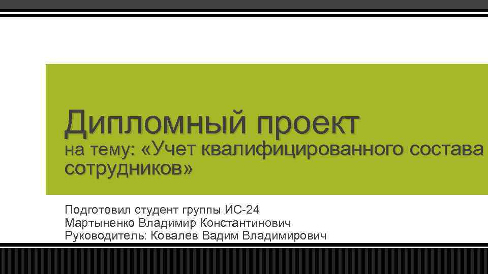 Дипломный проект на тему: «Учет квалифицированного состава сотрудников» Подготовил студент группы ИС-24 Мартыненко Владимир Константинович Руководитель: Ковалев Вадим Владимирович