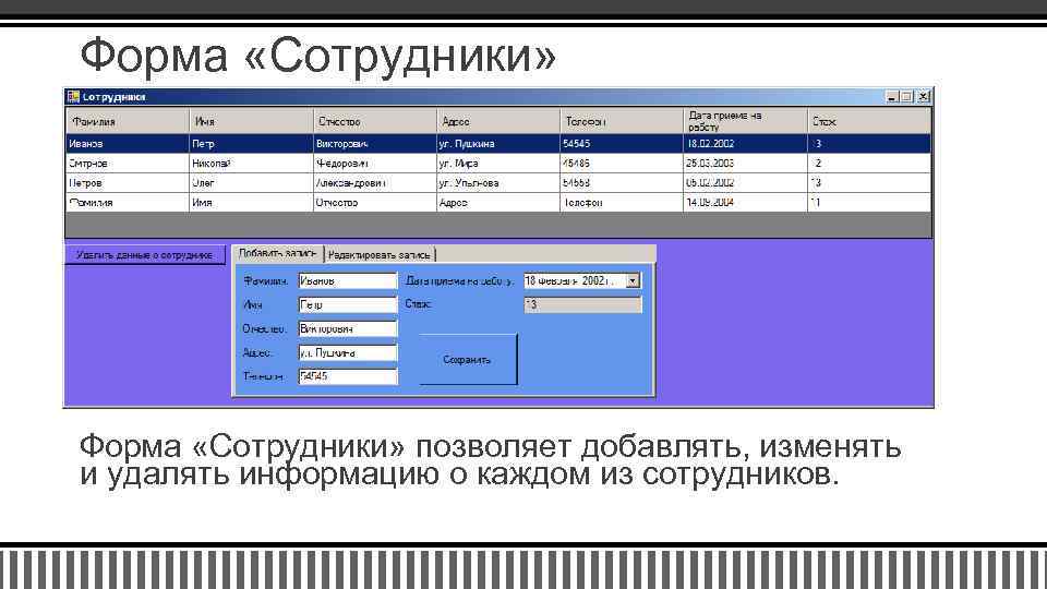 Форма «Сотрудники» позволяет добавлять, изменять и удалять информацию о каждом из сотрудников.