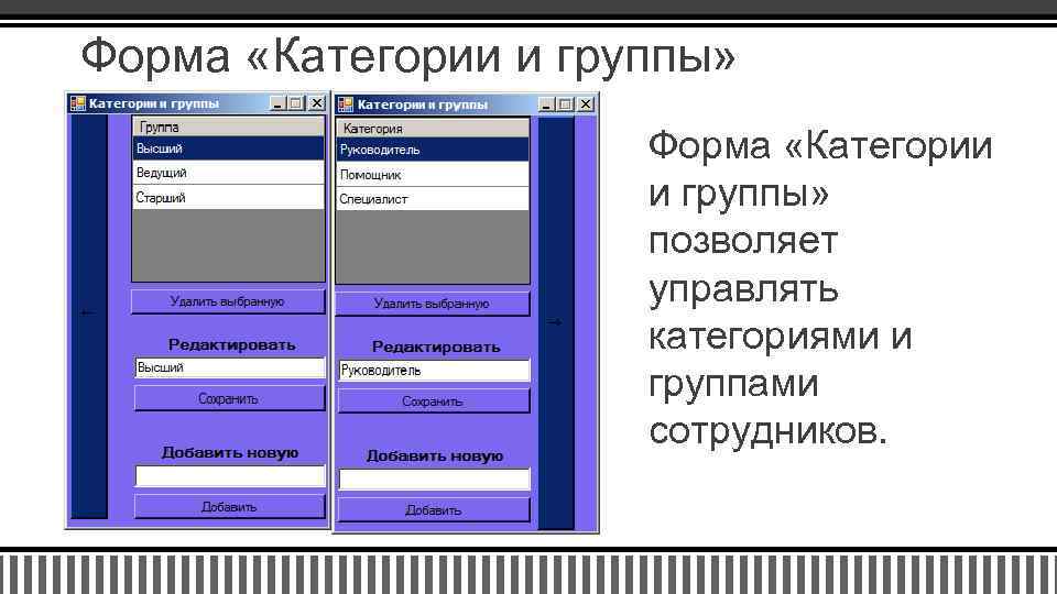 Форма «Категории и группы» позволяет управлять категориями и группами сотрудников.
