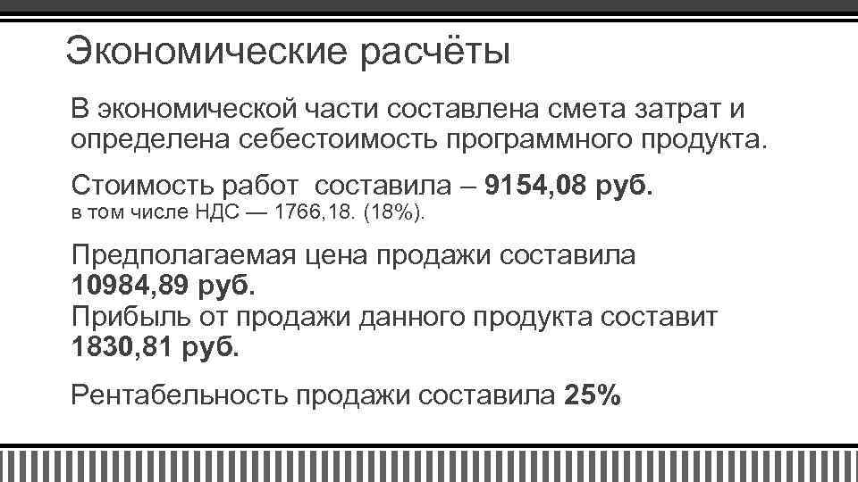 Экономические расчёты В экономической части составлена смета затрат и определена себестоимость программного продукта. Стоимость работ составила – 9154, 08 руб. в том числе НДС — 1766, 18. (18%). Предполагаемая цена продажи составила 10984, 89 руб. Прибыль от продажи данного продукта составит 1830, 81 руб. Рентабельность продажи составила 25%