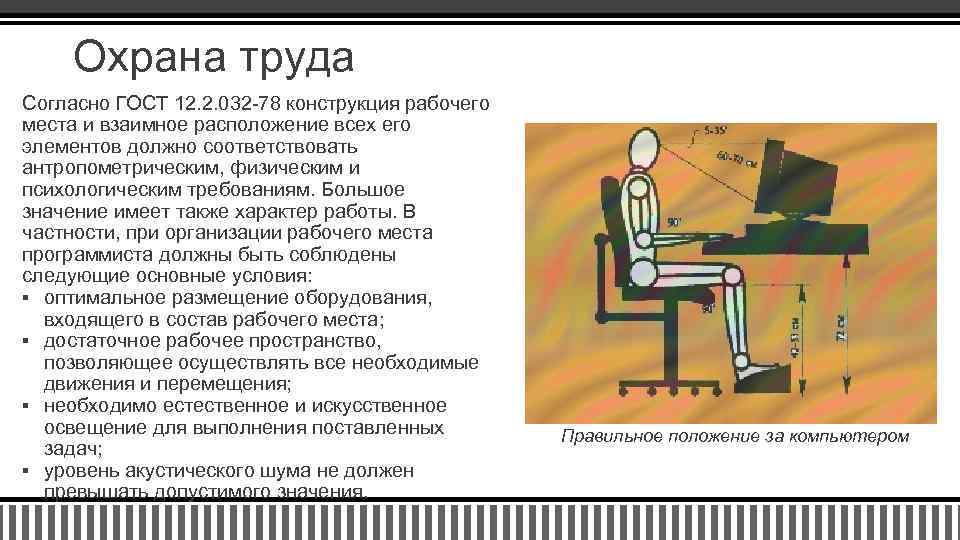 Охрана труда Согласно ГОСТ 12. 2. 032 -78 конструкция рабочего места и взаимное расположение всех его элементов должно соответствовать антропометрическим, физическим и психологическим требованиям. Большое значение имеет также характер работы. В частности, при организации рабочего места программиста должны быть соблюдены следующие основные условия: § оптимальное размещение оборудования, входящего в состав рабочего места; § достаточное рабочее пространство, позволяющее осуществлять все необходимые движения и перемещения; § необходимо естественное и искусственное освещение для выполнения поставленных задач; § уровень акустического шума не должен превышать допустимого значения. Правильное положение за компьютером
