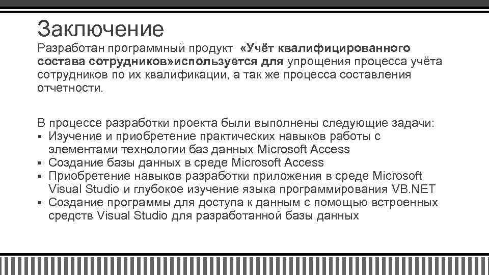 Заключение Разработан программный продукт «Учёт квалифицированного состава сотрудников» используется для упрощения процесса учёта сотрудников по их квалификации, а так же процесса составления отчетности. В процессе разработки проекта были выполнены следующие задачи: § Изучение и приобретение практических навыков работы с элементами технологии баз данных Microsoft Access § Создание базы данных в среде Microsoft Access § Приобретение навыков разработки приложения в среде Microsoft Visual Studio и глубокое изучение языка программирования VB. NET § Создание программы для доступа к данным с помощью встроенных средств Visual Studio для разработанной базы данных