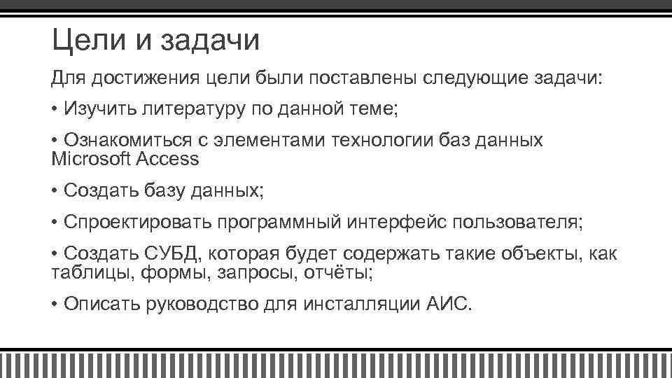 Цели и задачи Для достижения цели были поставлены следующие задачи: • Изучить литературу по данной теме; • Ознакомиться с элементами технологии баз данных Microsoft Access • Создать базу данных; • Спроектировать программный интерфейс пользователя; • Создать СУБД, которая будет содержать такие объекты, как таблицы, формы, запросы, отчёты; • Описать руководство для инсталляции АИС.
