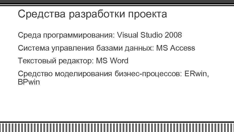 Средства разработки проекта Среда программирования: Visual Studio 2008 Система управления базами данных: MS Access Текстовый редактор: MS Word Средство моделирования бизнес-процессов: ERwin, BPwin