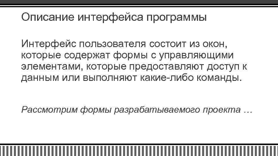 Описание интерфейса программы Интерфейс пользователя состоит из окон, которые содержат формы с управляющими элементами, которые предоставляют доступ к данным или выполняют какие-либо команды. Рассмотрим формы разрабатываемого проекта …