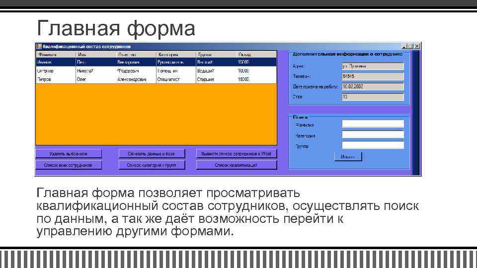 Главная форма позволяет просматривать квалификационный состав сотрудников, осуществлять поиск по данным, а так же даёт возможность перейти к управлению другими формами.