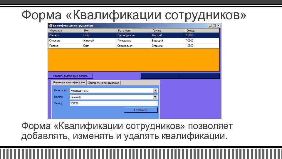 Форма «Квалификации сотрудников» позволяет добавлять, изменять и удалять квалификации.