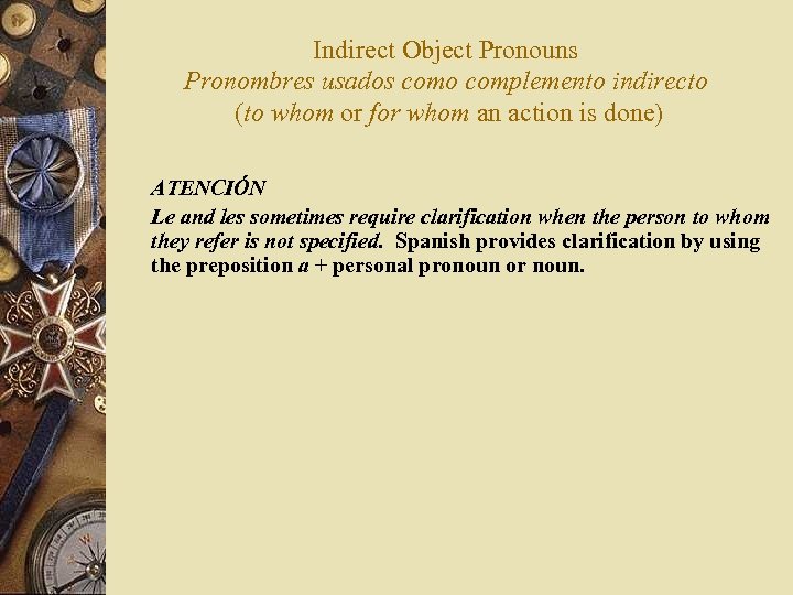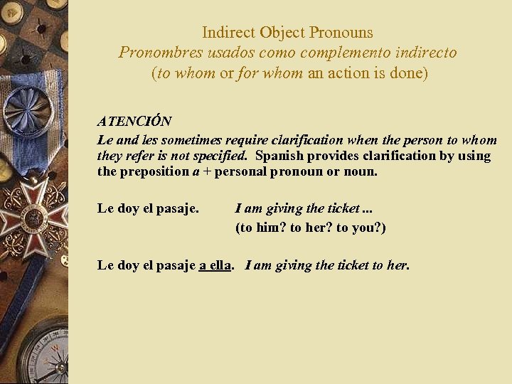 Indirect Object Pronouns Pronombres usados como complemento indirecto (to whom or for whom an action is done) ATENCIÓN Le and les sometimes require clarification when the person to whom they refer is not specified. Spanish provides clarification by using the preposition a + personal pronoun or noun. Le doy el pasaje. I am giving the ticket. . . (to him? to her? to you? ) Le doy el pasaje a ella. I am giving the ticket to her. The personal a prepositional phrase is optional, but the indirect object pronoun must always be used.