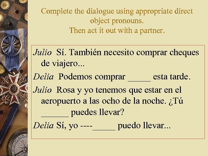 Complete the dialogue using appropriate direct object pronouns. Then act it out with a partner. Julio Sí. También necesito comprar cheques de viajero. . . Delia Podemos comprar los esta tarde. los Julio Rosa y yo tenemos que estar en el aeropuerto a las ocho de la noche. ¿Tú ______ puedes llevar? Delia Sí, yo _____ puedo llevar. . .