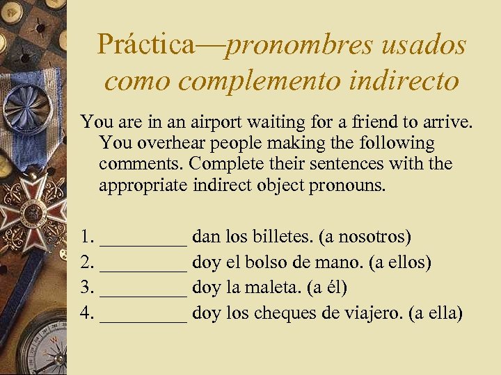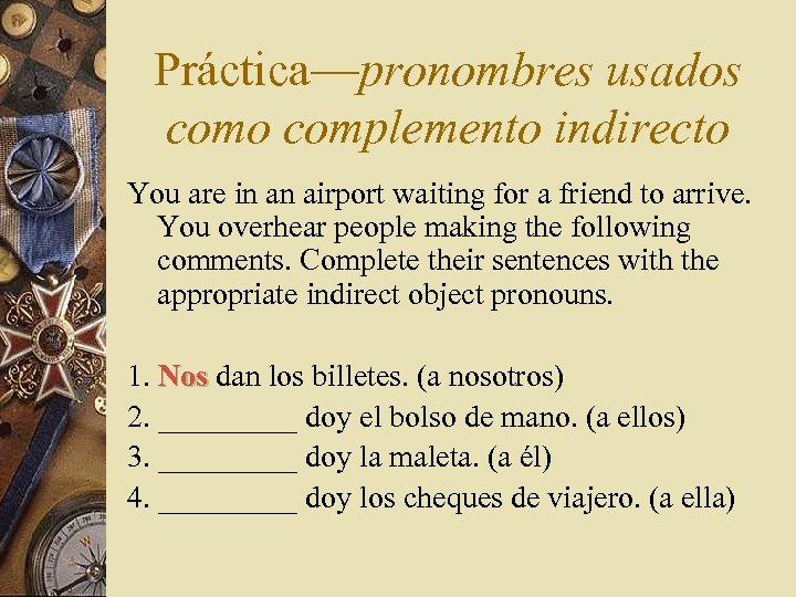 Práctica—pronombres usados como complemento indirecto You are in an airport waiting for a friend to arrive. You overhear people making the following comments. Complete their sentences with the appropriate indirect object pronouns. 1. Nos dan los billetes. (a nosotros) Nos 2. _____ doy el bolso de mano. (a ellos) 3. _____ doy la maleta. (a él) 4. _____ doy los cheques de viajero. (a ella)