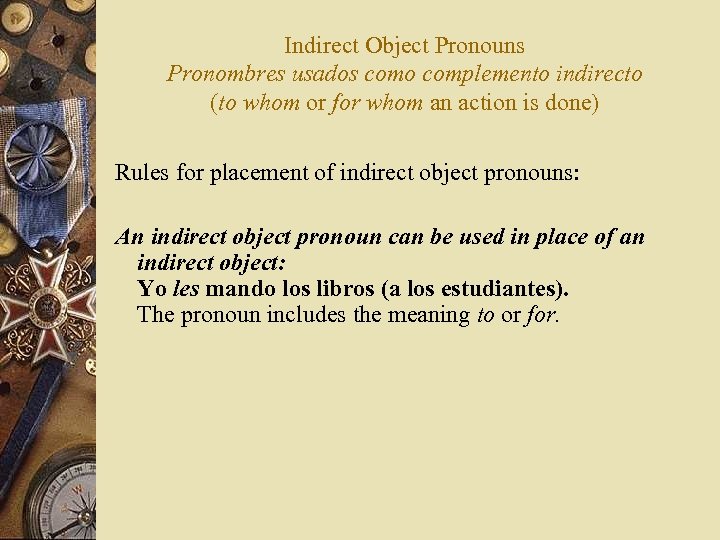 Indirect Object Pronouns Pronombres usados como complemento indirecto (to whom or for whom an action is done) Rules for placement of indirect object pronouns: An indirect object pronoun can be used in place of an indirect object: Yo les mando los libros (a los estudiantes). The pronoun includes the meaning to or for. Indirect object pronouns are usually placed in front of the conjugated verb: ¿Qué te dice tu papá en la tarjeta? What does your Dad say to you in the postcard?