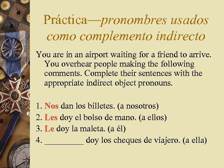 Práctica—pronombres usados como complemento indirecto You are in an airport waiting for a friend to arrive. You overhear people making the following comments. Complete their sentences with the appropriate indirect object pronouns. 1. Nos dan los billetes. (a nosotros) Nos 2. Les doy el bolso de mano. (a ellos) Les 3. Le doy la maleta. (a él) Le 4. Le doy los cheques de viajero. (a ella) Le