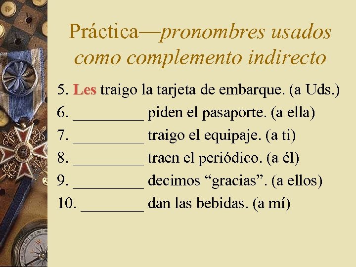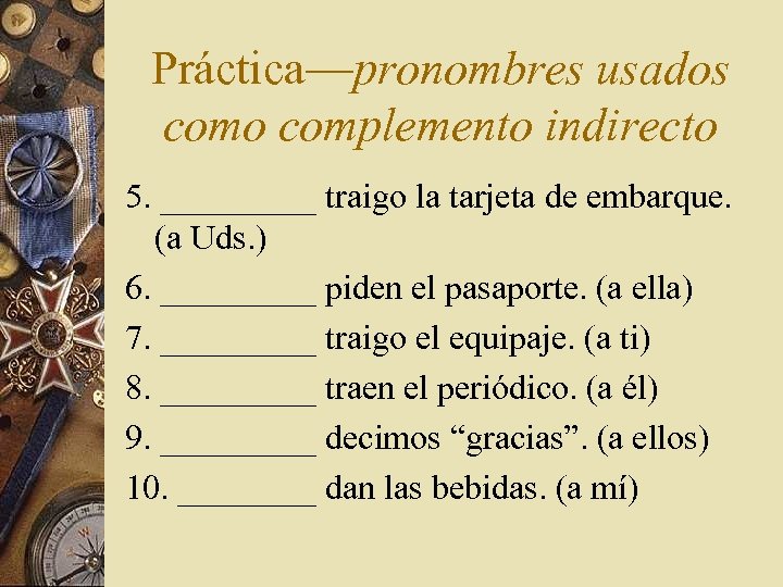 Práctica—pronombres usados como complemento indirecto 5. _____ traigo la tarjeta de embarque. (a Uds. ) 6. _____ piden el pasaporte. (a ella) 7. _____ traigo el equipaje. (a ti) 8. _____ traen el periódico. (a él) 9. _____ decimos “gracias”. (a ellos) 10. ____ dan las bebidas. (a mí)