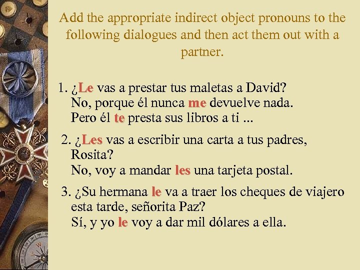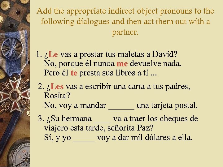 Add the appropriate indirect object pronouns to the following dialogues and then act them out with a partner. 1. ¿Le vas a prestar tus maletas a David? Le No, porque él nunca ______ devuelve nada. Pero él _______ presta sus libros a ti. . . 2. ¿____ vas a escribir una carta a tus padres, Rosita? No, voy a mandar ______ una tarjeta postal. 3. ¿Su hermana ____ va a traer los cheques de viajero esta tarde, señorita Paz? Sí, y yo _____ voy a dar mil dólares a ella.