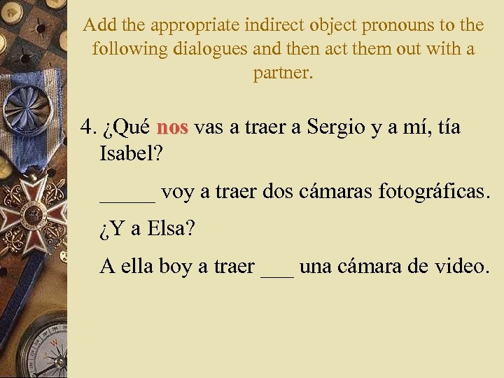 Add the appropriate indirect object pronouns to the following dialogues and then act them out with a partner. 4. ¿Qué nos vas a traer a Sergio y a mí, tía nos Isabel? _____ voy a traer dos cámaras fotográficas. ¿Y a Elsa? A ella boy a traer ___ una cámara de video.