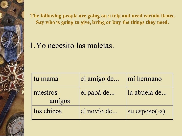 The following people are going on a trip and need certain items. Say who is going to give, bring or buy the things they need. 1. Yo necesito las maletas. tu mamá el amigo de. . . mi hermano nuestros amigos los chicos el papá de. . . la abuela de. . . el novio de. . . su esposo( a)
