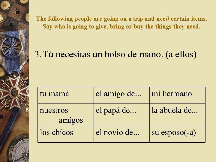 The following people are going on a trip and need certain items. Say who is going to give, bring or buy the things they need. 3. Tú necesitas un bolso de mano. (a ellos) tu mamá el amigo de. . . mi hermano nuestros amigos los chicos el papá de. . . la abuela de. . . el novio de. . . su esposo( a)