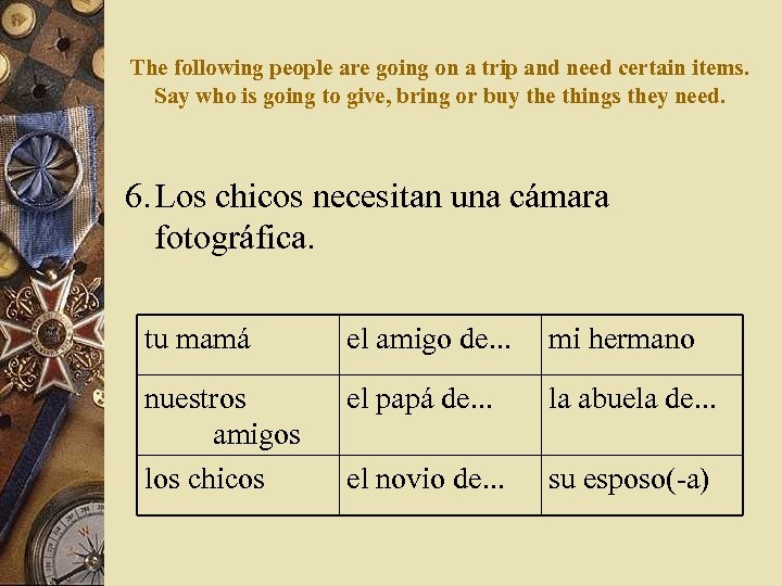 The following people are going on a trip and need certain items. Say who is going to give, bring or buy the things they need. 6. Los chicos necesitan una cámara fotográfica. tu mamá el amigo de. . . mi hermano nuestros amigos los chicos el papá de. . . la abuela de. . . el novio de. . . su esposo( a)