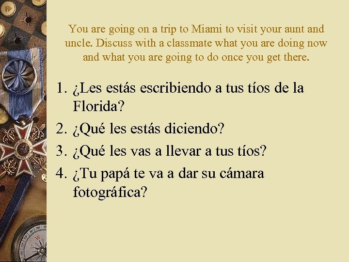 You are going on a trip to Miami to visit your aunt and uncle. Discuss with a classmate what you are doing now and what you are going to do once you get there. 1. ¿Les estás escribiendo a tus tíos de la Florida? 2. ¿Qué les estás diciendo? 3. ¿Qué les vas a llevar a tus tíos? 4. ¿Tu papá te va a dar su cámara fotográfica?