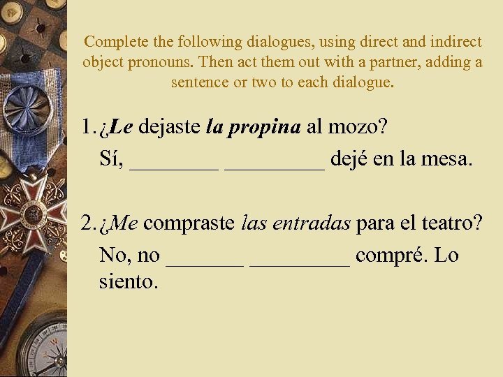 Complete the following dialogues, using direct and indirect object pronouns. Then act them out with a partner, adding a sentence or two to each dialogue. 1. ¿Le dejaste la propina al mozo? Sí, _________ dejé en la mesa. 2. ¿Me compraste las entradas para el teatro? No, no _________ compré. Lo siento.