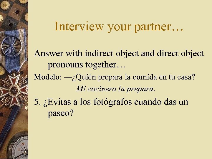 Interview your partner… Answer with indirect object and direct object pronouns together… Modelo: —¿Quién prepara la comida en tu casa? Mi cocinero la prepara. 5. ¿Evitas a los fotógrafos cuando das un paseo?